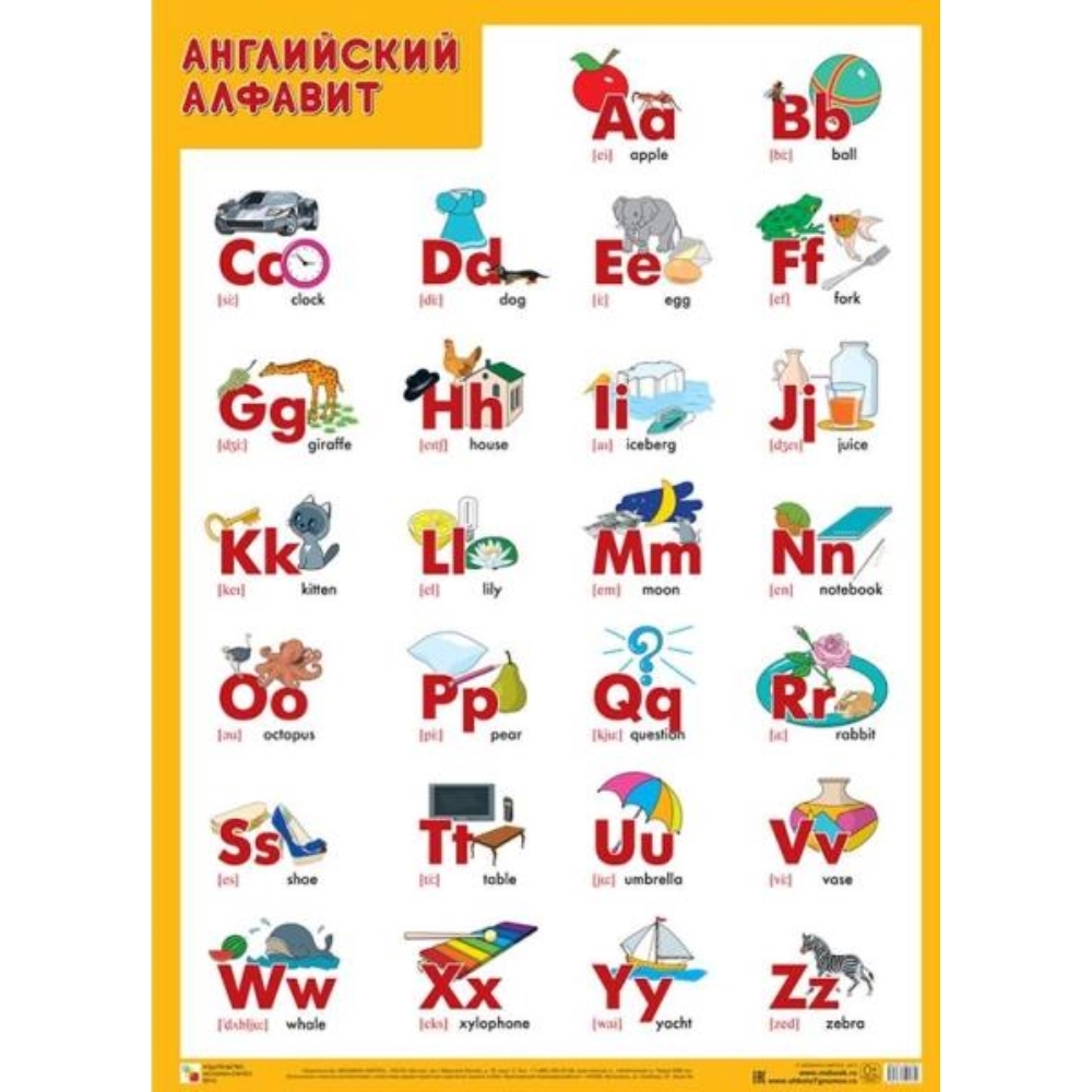 С помощью этого плаката ребенок сможет сделать первые шаги в изучении английского языка: выучить алфавит, познакомиться с произношением английских букв внутри слов, запомнить первые слова на иностранном языке. Рядом с каждой буквой изображены предметы, в названии которых данная буква является первой, что служит подсказкой для ребенка и помогает получать знания в игровой форме.