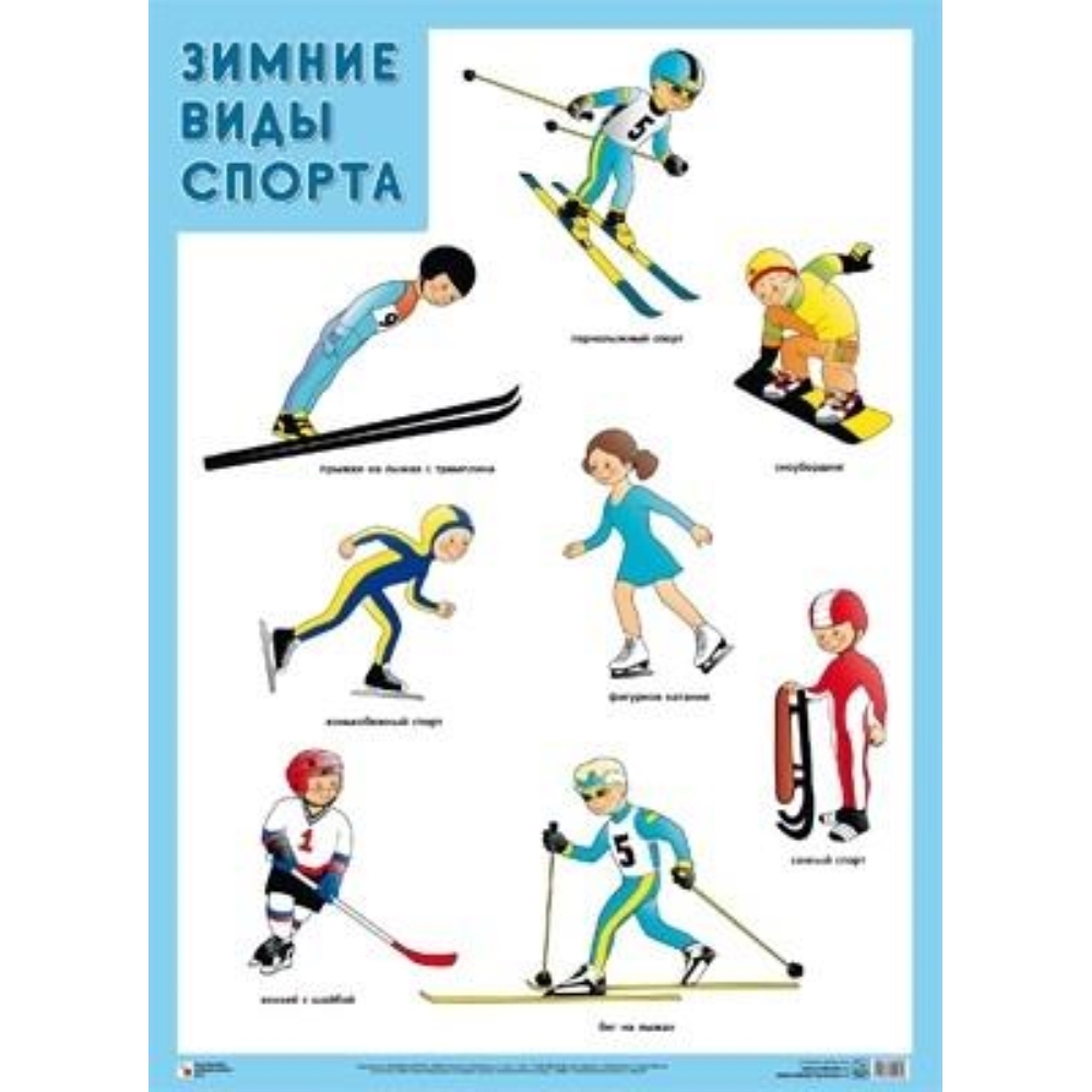 Этот плакат познакомит Вашего малыша с зимними видами спорта: конькобежным, лыжным, санным и др. Красочные иллюстрации помогут ребёнку легко и быстро изучить и запомнить названия зимних видов спорта, спортивного инвентаря.