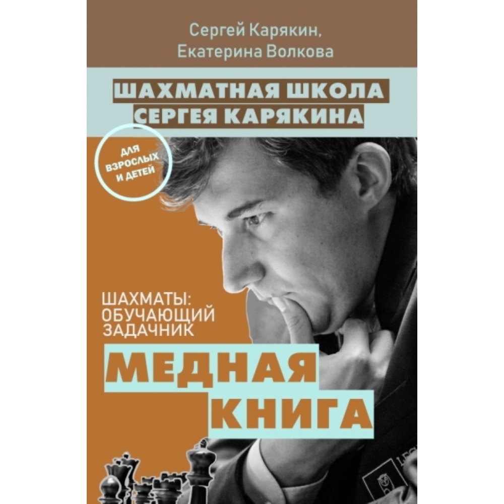 "Медная книга" – первая книга серии шахматных задачников ведущего шахматиста мира Сергея Карякина. Книга-задачник предназначена для начинающих шахматистов и содержит более 400 заданий на мат в один ход. Задания расположены по возрастанию сложности и помогут юному шахматисту натренировать умение находить мат в один в шахматной партии быстро и верно. Книга-задачник подходит для занятий в школах, кружках, спортивных школах и самостоятельно дома с родителями. В книге вы найдете основные правила шахмат, изучив которые сразу натренируете главный навык шахматиста – выигрывать простые позиции на мат в один ход.