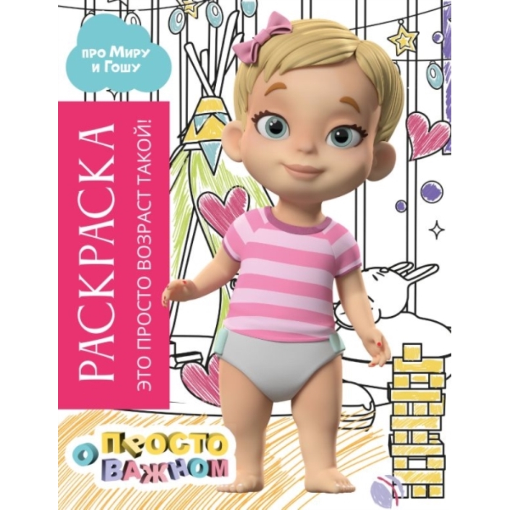 "Просто о важном" - популярный мультфильм о взаимоотношениях в семье и с окружающим миром! Вместе с героями вас ждут: * крупные иллюстрации специально для маленьких художников; * вопросы, на которые можно отвечать всей семьёй; * вдохновляющие страницы - придумай историю о Мире, Гоше и Бейби. Скорее открывай раскраску - друзья из мультфильма уже заждались тебя!
