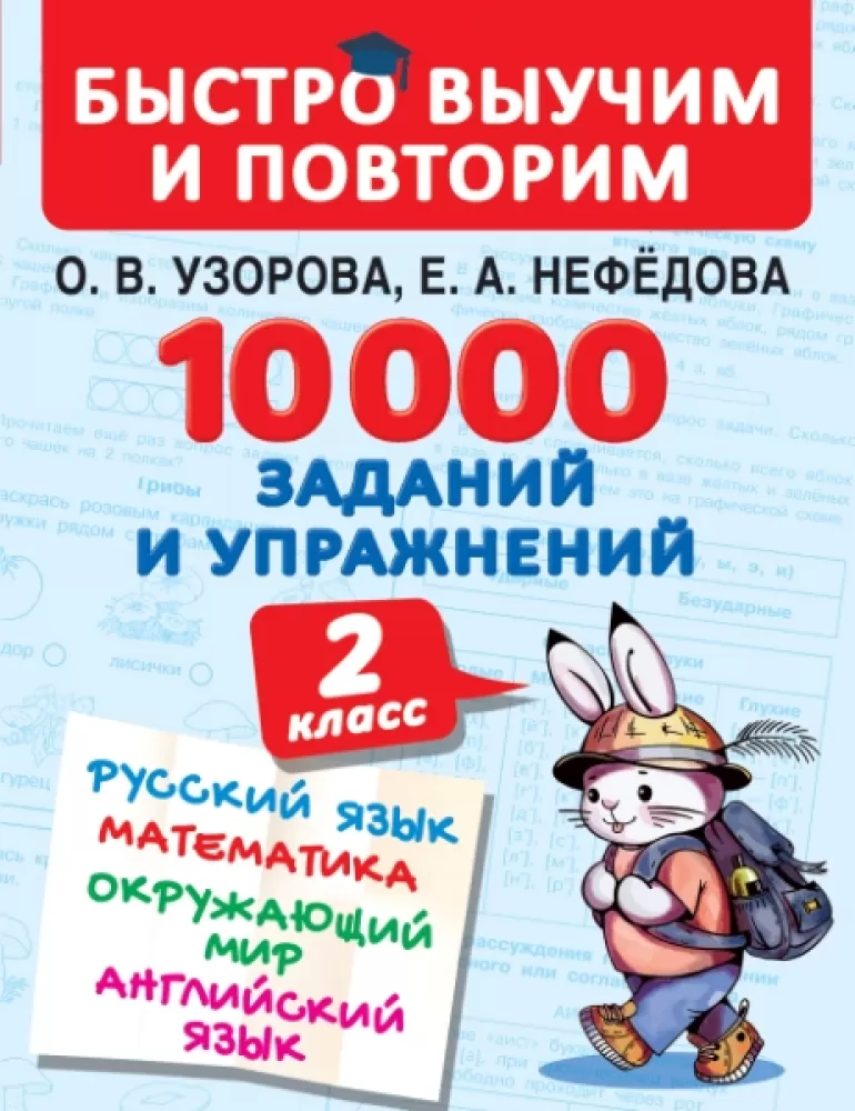 Книга известных педагогов-практиков О.Е. Узоровой и Е.А. Нефёдовой «10000 заданий и упражнений. 2 класс. Русский язык. Математика. Окружающий мир, Английский язык» – это сборник заданий для проверки знаний и повторения пройденного материала по предметам «Русский язык», «Математика», «Окружающий мир» и «Английский язык». Выполняя задания и решая примеры, ученик закрепит знания, полученные в процессе обучения. Занимательные упражнения на полях книги помогут школьнику потренировать интеллект и логику, развить творческие способности. Пособие можно использовать для работы дома и в классе по всем федеральным программам начальной школы. Для начального образования.