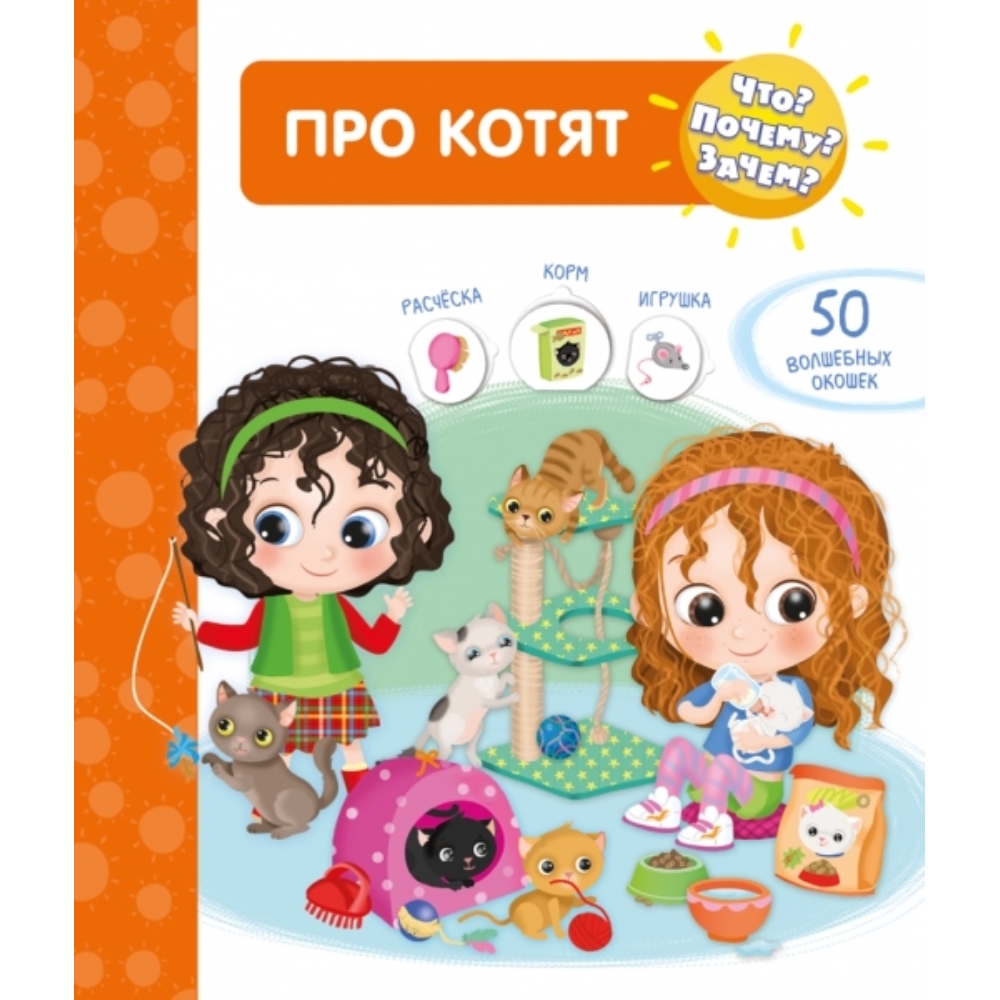 Иллюстрированная энциклопедия «Что? Почему? Зачем? Про котят» предназначена для развивающих занятий взрослых с детьми дошкольного возраста. Она подарит вашему ребёнку возможность в игровой и увлекательной форме узнать о том, как правильно ухаживать за кошками, как растут и развиваются котята и что они любят. Яркая и привлекательная книга удобного для детских ручек формата напечатана на высококачественном ламинированном картоне повышенной прочности с закругленными краями страниц.На каждом книжном развороте внимание любознательного малыша привлекут красочные иллюстрации и волшебные окошки с интересными сюжетами о повадках и особенностях кошек.Ваш малыш будет с удовольствием рассматривать детально прорисованные картинки, открывая для себя новые интересные подробности, а многочисленные «секретные» окошки-клапаны с дополнительной информацией превратят чтение в увлекательную игру, разовьют внимание и любознательность. Издание станет замечательным подарком для юных «почемучек» и ценным пополнением домашней библиотеки.