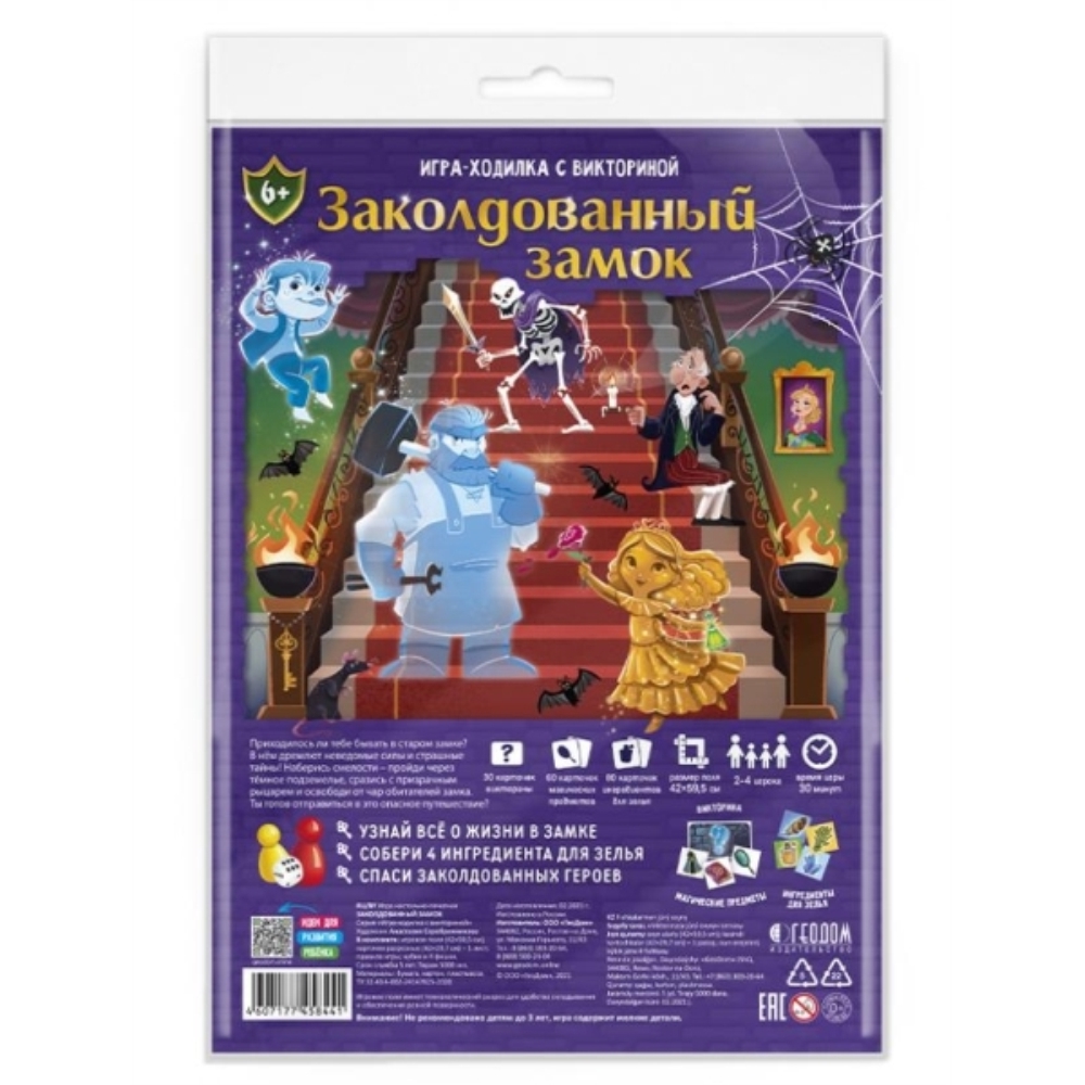 Игра-ходилка с викториной «Заколдованный замок»- это увлекательное приключение в мир волшебства! Здесь героев ждут подземелья, призраки и заколдованные обитатели замка! Нужно не просто дойти первым, а собрать все ингредиенты волшебного зелья и расколдовать короля, а вместе с ним и всех его придворных. В комплект игры входят карточки с вопросами викторины, карточки с магическими предметами и ингредиентами для приготовления зелья, а также кубик с фишками для игры. Отправляйтесь в сказочный путь прямо сейчас - и вас ждут увлекательные приключения!Комплектация: - Игровое поле 59*42 см, - 4 фишки, кубик, - 30 карточек викторины, 60 карточек магических предметов, 80 карточек ингредиентов для зелья.