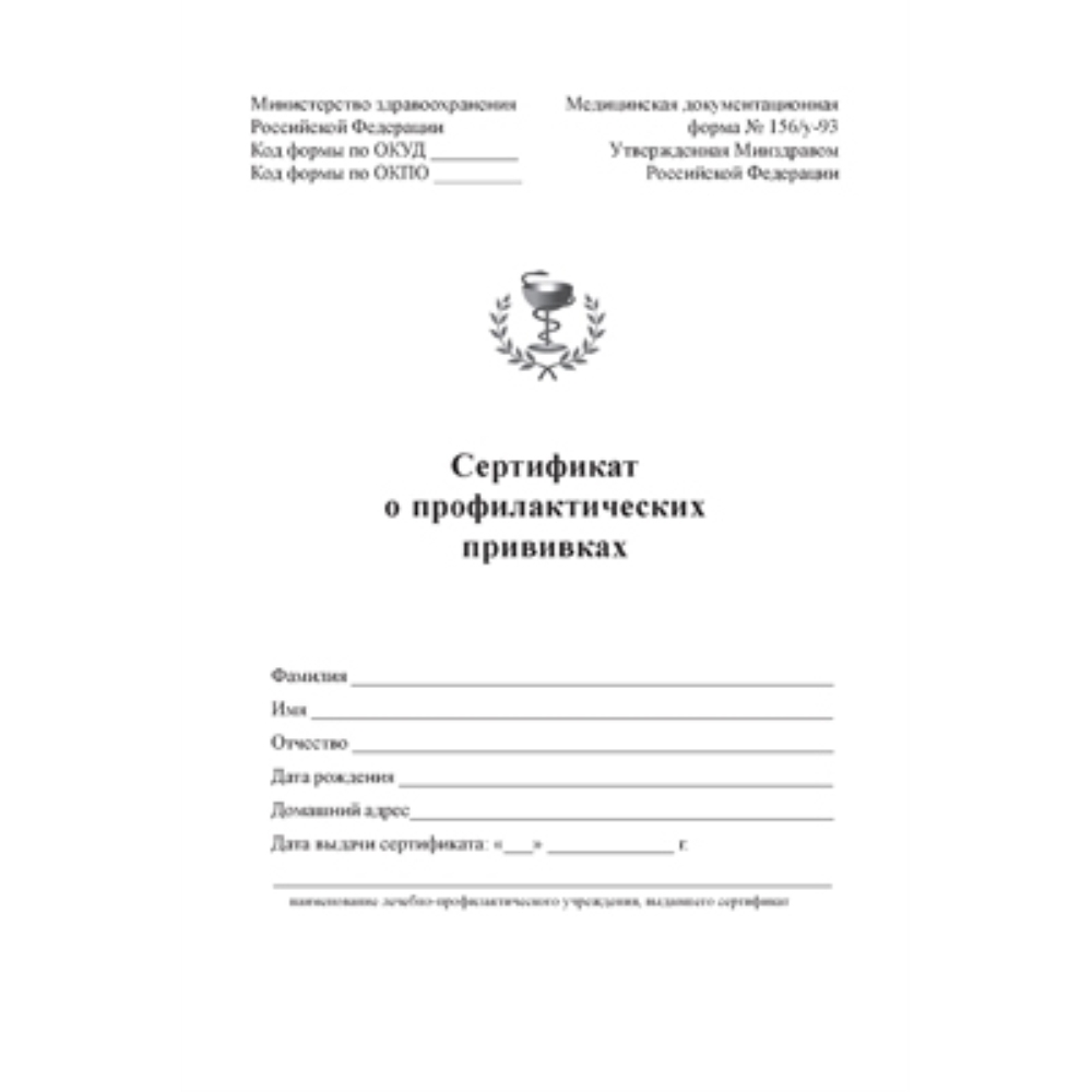 Министерство здравоохранения Российской ФедерацииМедицинская документационная форма № 156/у-93Сертификат о профилактических прививках.