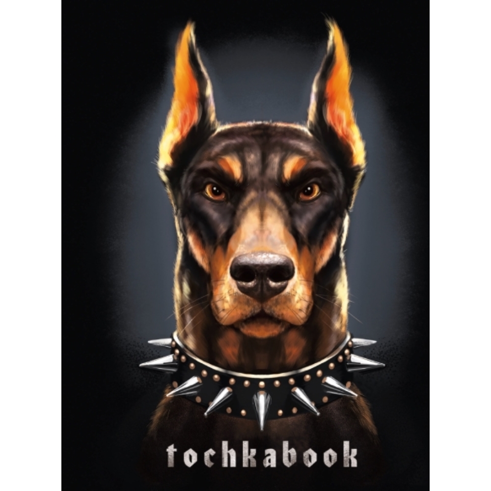 Точкабук с брутальными доберманом можно рассматривать в качестве подарка для мужчины, начальника, делового партнёра, особенного клиента. Сдержанные цвета и тёмный фон придают обложке благородный вид. Блокнот покрыт фактурным лаком и фольгой, которую становится видно, когда на блокнот попадает световой блик. В точкабуке 72 белых листа в мелкую серую точку. Такой блокнот подойдёт для деловых и творческих записей.