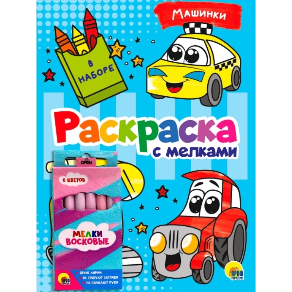 Представляем новую серию раскрасок для малышей в комплекте с восковыми мелками. Наборы представлены в четырёх темах: «Машинки», «Монстрики», «Волшебный мир» и «Домашние животные», в каждом – 16-страничные книжки с крупными черно-белыми картинками – для удобства раскрашивания мелками.