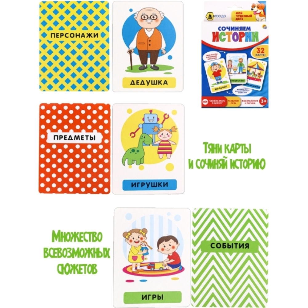Логика и воображение — важные навыки, которыми должен овладеть ребенок, но как сделать это весело и интересно? Мы предлагаем воспользоваться набором карточек, которые помогут в игровой форме развить важные навыки ребенка. Вы можете сначала рассказать и показать ребенку увлекательную историю, после чего он выкладывает карточки в правильной последовательности. Также ребенок может самостоятельно выложить карточки в логической последовательности и рассказать историю без участия взрослых. В наборе: 32 карточки.