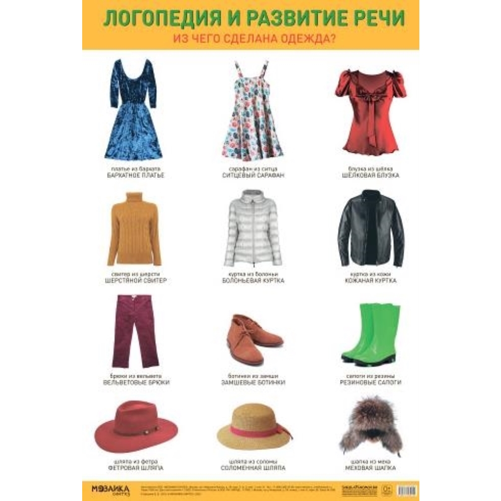 Плакат «Из чего сделана одежда?» выходит в рамках серии тематических плакатов Логопедия и развитие речи.Данный наглядно-дидактический плакат используется воспитателем, учителем –логопедом на занятиях по развитию речи и ознакомлению с окружающим миром для расширения и уточнения представлений детей об одежде, углубления знаний о материалах, из которых сделана одежда, обувь, головные уборы, их назначении и применении, а также для упражнения дошкольников в образовании имен прилагательных, имен существительных в родительном падеже множественного числа.Плакат может быть использован в работе с детьми в детском саду, в учреждениях дополнительного образования, дома.