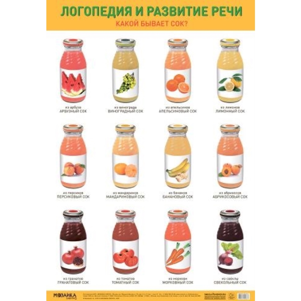 Плакат «Какой бывает сок?» выходит в рамках серии тематических плакатов Логопедия и развитие речи.Данный наглядно-дидактический плакат используется воспитателем, учителем –логопедом на занятиях по развитию речи и ознакомлению с окружающим миром для расширения и уточнения знаний у детей о видах сока, из каких фруктов, ягодок и овощей изготавливается, а также для упражнения дошкольников в образовании имен прилагательных, имен существительных в родительном падеже множественного числа.Плакат может быть использован в работе с детьми в детском саду, в учреждениях дополнительного образования, дома.