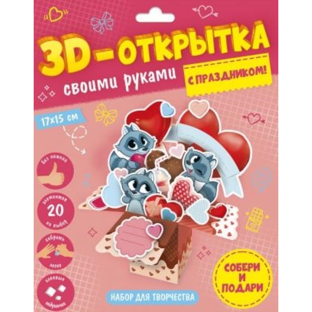 Подарок – своими руками! В этом наборе для творчества есть всё, что нужно, чтобы сделать необычную 3D-открытку без помощи ножниц: основа для открытки-коробочки, 20 ярких элементов на выбор, клеевые подушечки. Посмотри пошаговую инструкцию, собери и удиви родных и близких оригинальным подарком! Набор для творчества развивает мелкую моторику, воображение и творческое мышление.