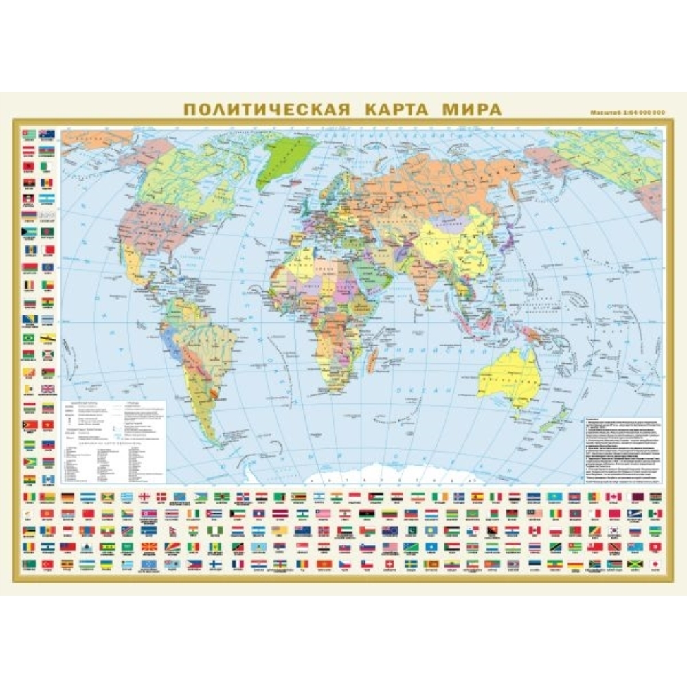 Двухсторонняя покрытая антибликовой полимерной плёнкой карта имеет размеры 575 мм х 420 мм. На одной её стороне - Политическая карта мира в масштабе 1:80 000 000 (в 1 см 800 км), на другой – карта «Федеративное устройство России» масштаба 1:15 000 000 (в 1 см 150 км). На обновлённой Политической карте представлены все независимые государств мира с их столицами, а также владения и территории с особым статусом. Населённые пункты на карте даны в трёх градациях численности: более 1 млн жителей, от 100 тыс. до 1 млн, менее 100 тыс. жителей. Карта обрамлена официальными флагами государств мира, расположенными в алфавитном порядке, что облегчает их поиск. На карте "Федеративное устройство России" показаны все 89 субъектов Федерации с их столицами и центрами, включая новые - Донецкую и Луганскую народные республики, Запорожскую и Херсонскую области, Республику Крым и Севастополь. Субъекты РФ сгруппированы по 8 федеральным округам. Красочным обрамлением карты являются флаги и гербы республик, краёв, областей, автономных образований и городов – субъектов Российской Федерации. Рекомендовано для широкого круга пользователей.