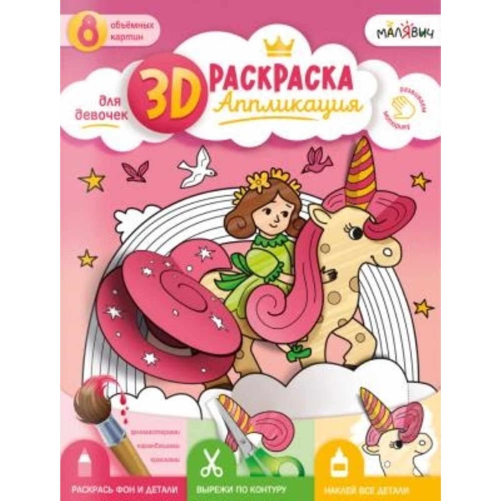 «3D-раскраска-аппликация. Для девочек» под брендом «МалЯвич» – это творческая тетрадь для создания объёмных картин! Внутри 8 картинок принцесс и детали к ним. Раскрасьте, вырежьте, приклейте – и полюбуйтесь результатом! Готовые картины можно подарить друзьям, украсить ими комнату или устроить выставку. Рекомендовано для детей дошкольного возраста.