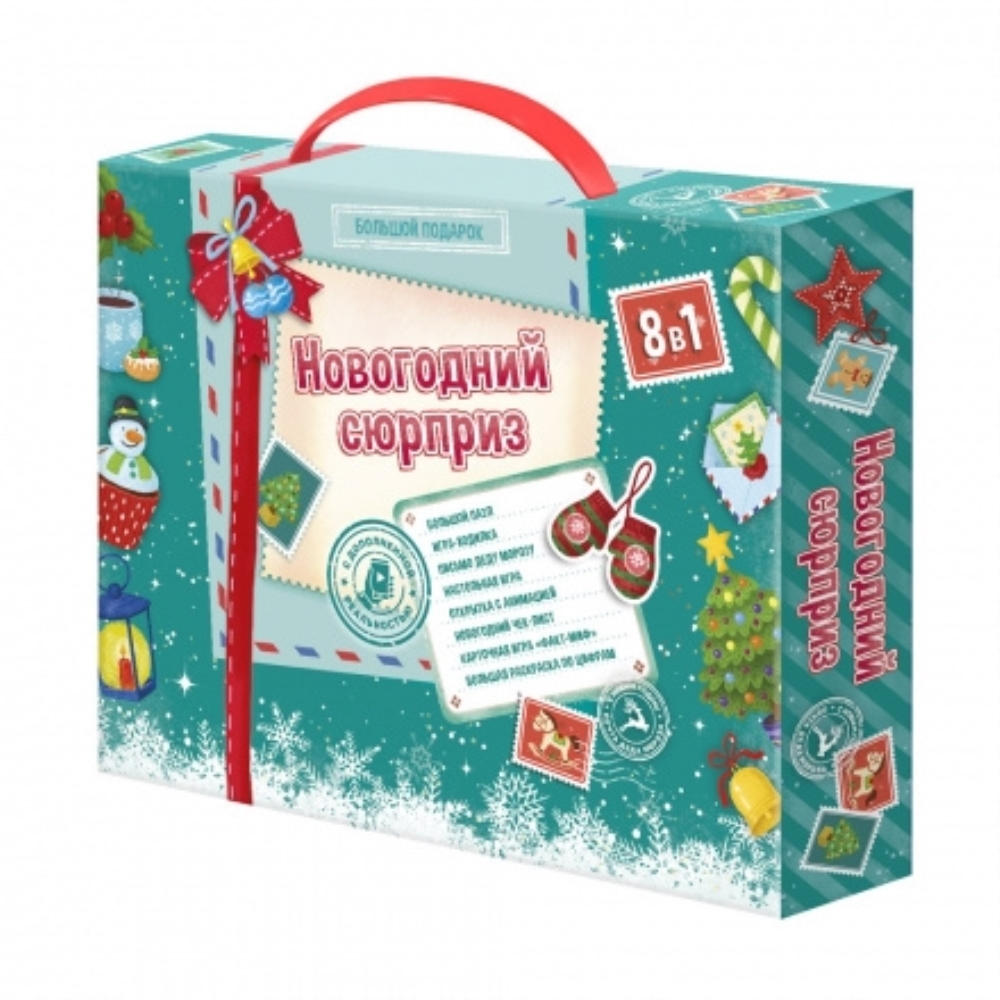 Большой подарок «Новогодний сюрприз» – это 8 в 1 для создания волшебного праздника! В комплекте: большой пазл, игра-ходилка с заданиями, письмо Деду Морозу, новогодний чек-лист, настольная игра на развитие стратегического мышления, карточная игра, большая раскраска по цифрам и открытка с дополненной реальностью. Проведите время с семьёй и друзьями весело и интересно! Рекомендованный возраст: 6+.