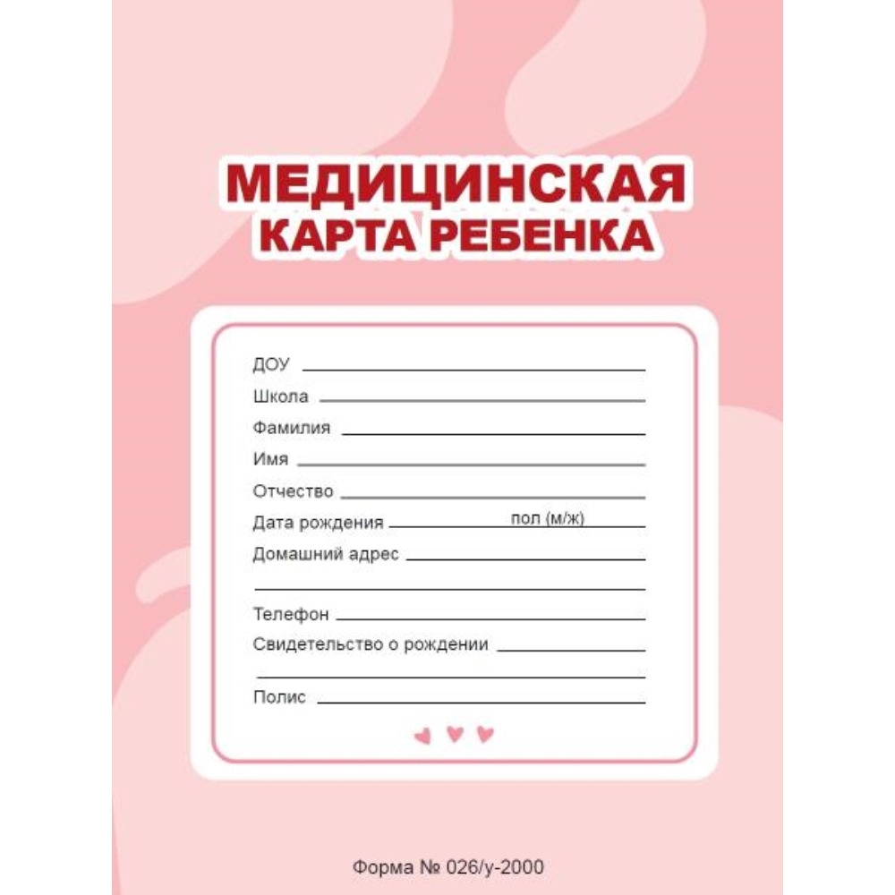 Медицинская карта ребёнка составлена в соответствии с утверждённой формой № 026/у-2000 и предназначена для использования в образовательных учреждениях: детских садах и школах. Обложка карты выполнена из плотного целлюлозного картона с глянцевой ламинацией, благодаря чему карта сохранит аккуратный вид в течение долгого времени.