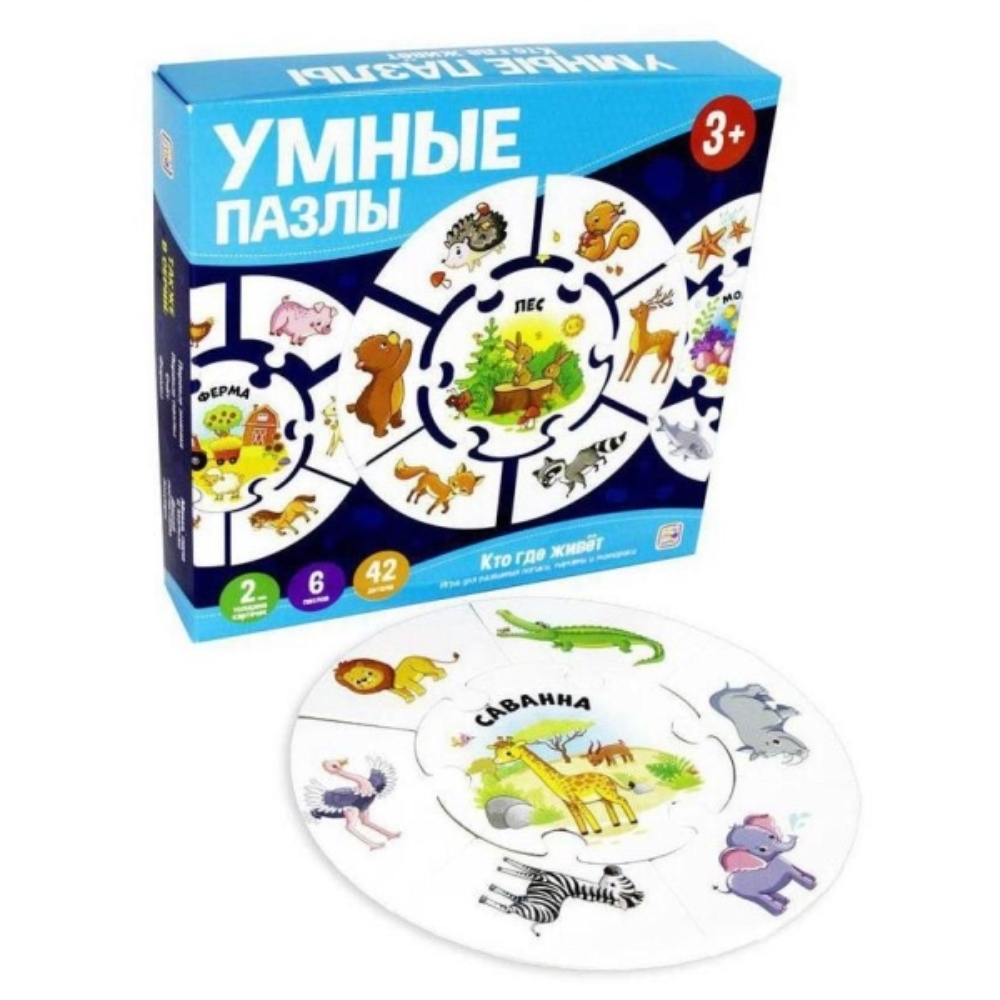 «Умные пазлы. Кто где живёт» — это развивающие пазлы для детей от 3-х лет. В наборе 6 пазлов (42 детали), выполненных из плотного картона, покрытых ВД-лаком, и инструкция с развивающими играми. Пазлы упакованы в коробку.