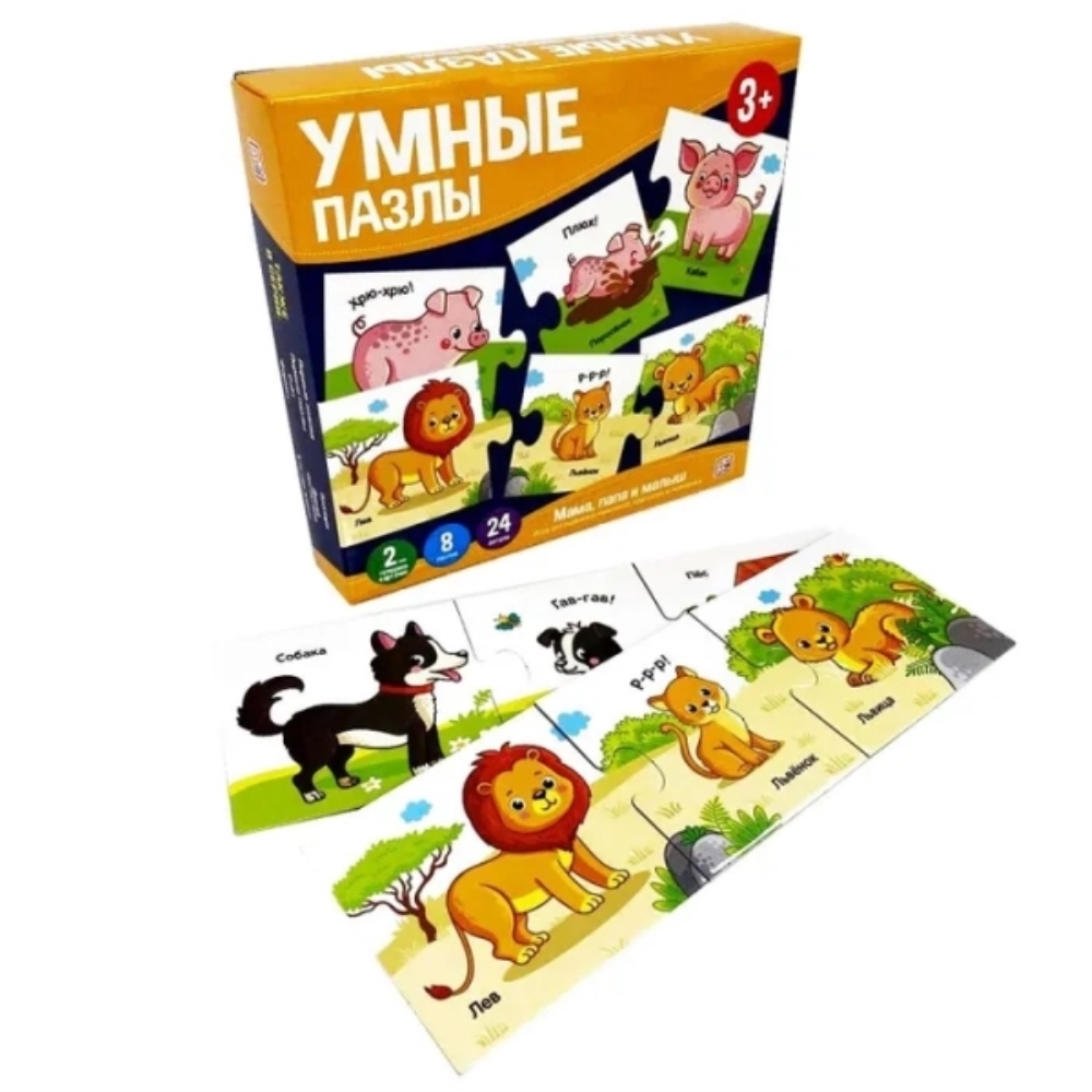 «Умные пазлы. Мама, папа и малыш» - это развивающие пазлы для детей, которые познакомят ребёнка с животными и их малышам и в игровой форме помогут закрепить полученные знания. Игра способствует развитию кругозора ребёнка, моторики, логического мышления, усидчивости, внимания и памяти. Пазлы выполнены из плотного картона, крупные детали не выскальзывают из детских ручек и легко соединяются друг с другом. Порадуйте своего ребенка весёлой развивающей игрой «Умные пазлы. Мама, папа и малыш»!