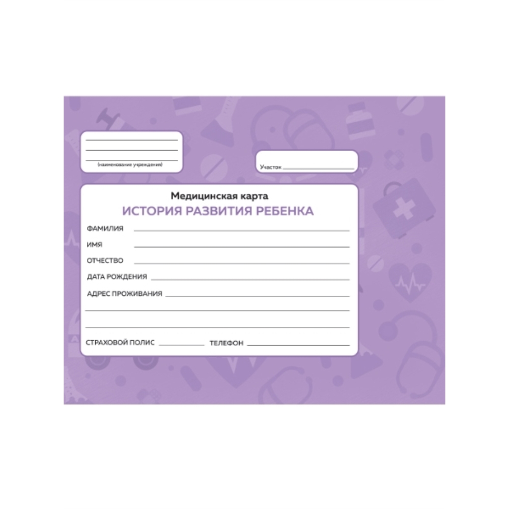 Медицинская карта необходима с рождения каждому малышу. Наша карта составлена по стандартной форме 112/у История развития ребенка и содержит разделы для сведений о новорожденном, профилактических осмотрах, диагнозах, вакцинации и многом другом, а также большое количество дополнительных страниц. Благодаря твёрдой обложке и удобной резинке карта прослужит долгие годы, сохранив аккуратный вид.