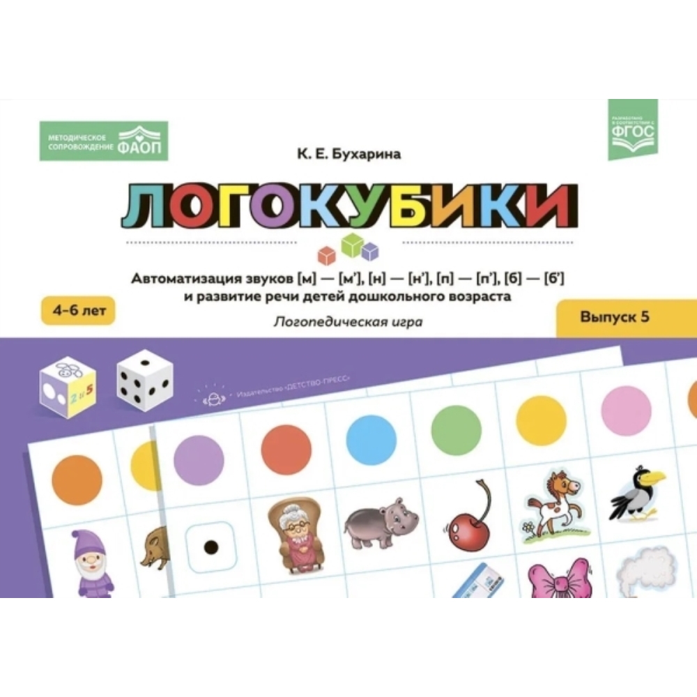 Логопедическая игра "Логокубики" предназначена для развития речи и автоматизации звуков [м]-[м‘], [н]-[н‘], [б]-[б‘], [п]-[п‘] у детей 4-6 лет. В пособии представлены четыре игровых поля-таблицы. В каждой таблице 36 цветных изображений предметов, в названиях которых звуко слышится в разных позициях (в начале слов, середине и конце слова). Также даны развертки четырех игровых кубиков, которые нужно вырезать и склеить. Пособие адресовано учителям-логопедам, учителям-дефектологам, воспитателям ДОУ и родителям детей 4-6 лет для совместных игр.