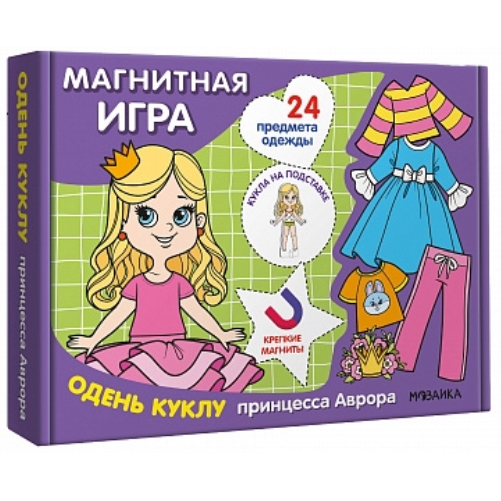 Одень куклу. Принцесса Аврора (Магнитная игра) «Одень куклу. Принцесса Аврора» — это игра, которая надолго займет ребенка и разовьет его фантазию. В коробке находится фигурка куколки и 24 магнитных предмета одежды. Кукла устанавливается на подставку, после чего можно подобрать ей подходящий наряд для любого случая. Одежда на крепких магнитах хорошо держится на кукле, поэтому с ней можно полноценно играть. А если собрать всю коллекцию, то вариаций для игр станет ещё больше — одежда из разных наборов подходит всем куклам в серии.