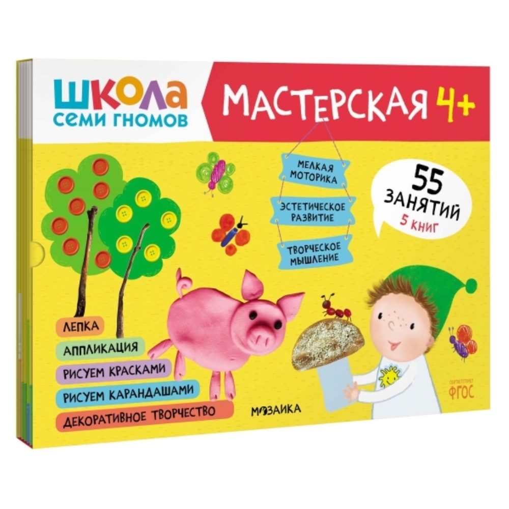 Школа семи гномов. Мастерская 4+ (набор из 5 альбомов для творчества) «Школа Семи Гномов. Мастерская 4+» — это набор красочных альбомов для увлекательных занятий творчеством с детьми от 4 до 5 лет. Занятия на близкие и понятные ребенку темы расположены по мере усложнения: поступательно переходя от освоения простых навыков к более сложным заданиям. Результатом каждого занятия станет законченное произведение, которое ребенок создал сам. В конце альбома маленького художника ждет большое итоговое задание, где он сможет применить все свои новые умения. В набор входят 5 альбомов, с которыми ребенок научится создавать: • аппликации с помощью бумаги и клея (альбом «Аппликация»); • творческие работы из подручных материалов с помощью клея и пластилина (альбом «Декоративное творчество»); • творческие работы на бумаге с помощью пластилина (альбом «Лепка»); • рисунки с помощью карандашей или фломастеров (альбом «Рисуем карандашами»); • рисунки с помощью красок и кисточки (альбом «Рисуем красками»).