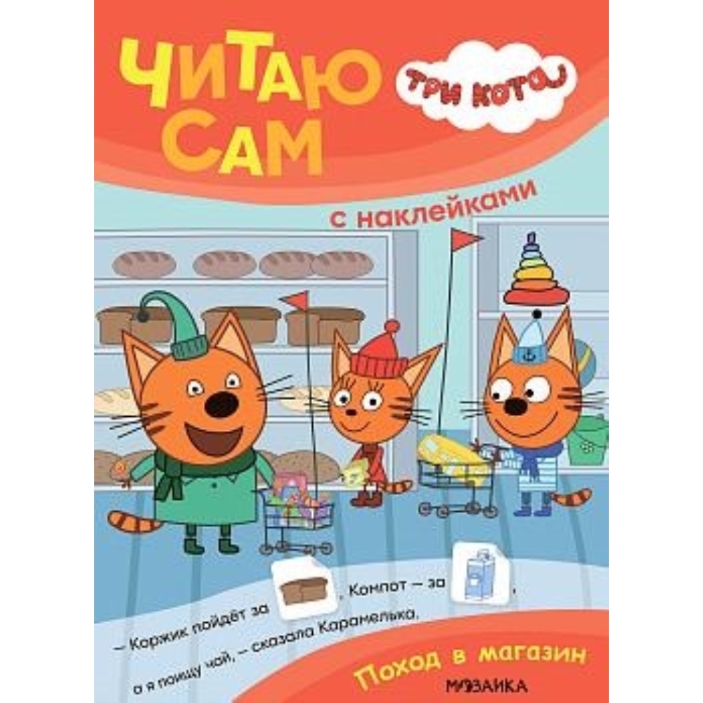 Поход в магазин (Три кота. Читаю сам с наклейками) Книга «Поход в магазин» серии «Три кота. Читаю сам с наклейками» идеально подойдет для обучения чтению, развития речи, мышления и мелкой моторики вашего малыша. Некоторые слова заменены картинками. Приклеивайте яркие наклейки, называйте «пропущенные» слова и читайте любимые истории про приключения котят. Учитесь читать вместе с героями популярного мультсериала «Три кота»!