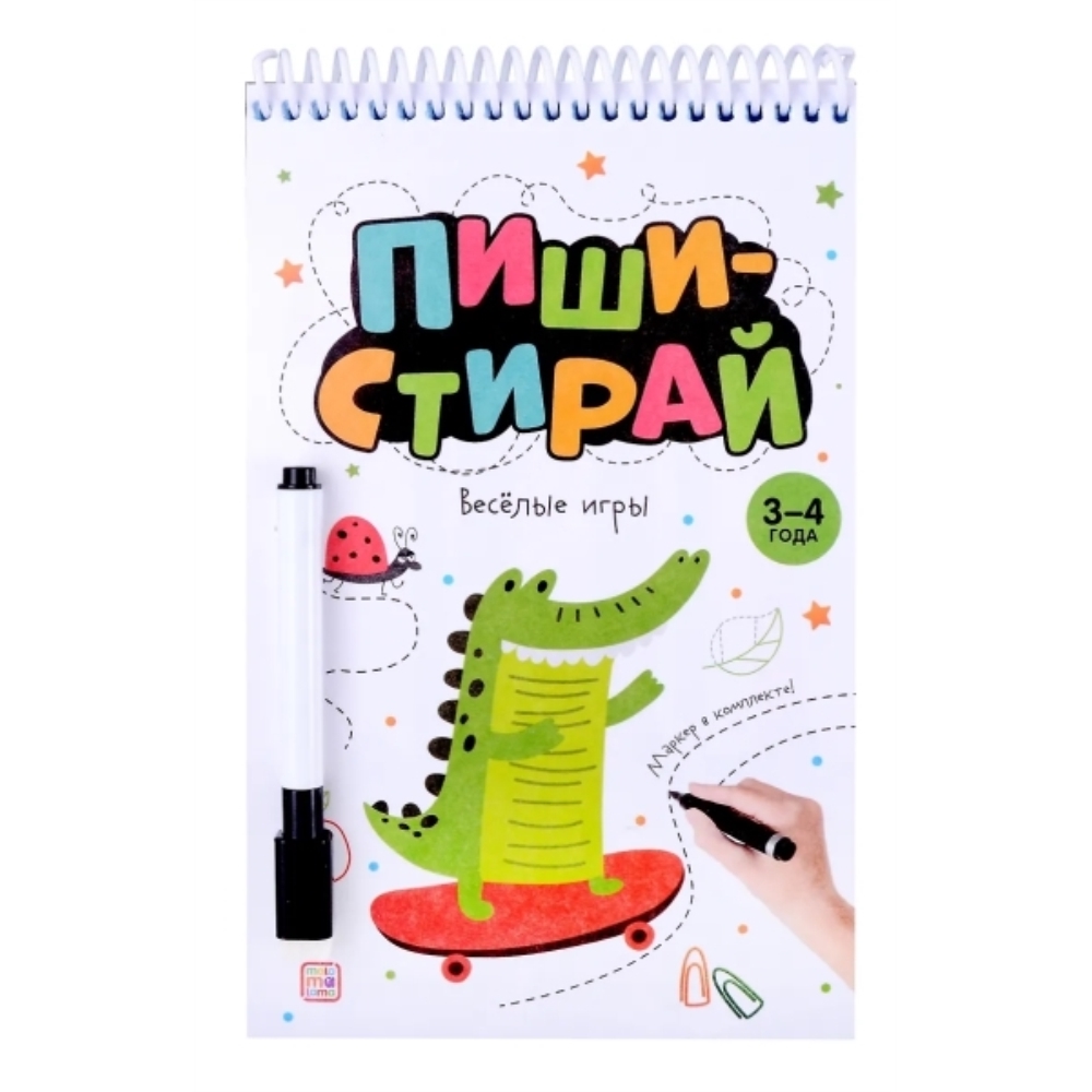 "Весёлые игры» от Malamalama — это увлекательный игровой блокнот для детей 3–4 лет. Внутри — иллюстрированные странички с простыми и интересными заданиями, которые помогают развивать мелкую моторику и координацию движений, а также улучшать письменные навыки. В комплекте ребёнок найдёт маркер для выполнения заданий. Глянцевое покрытие страниц позволяет стирать следы маркера, используя для этого сухую ткань. Благодаря этому в блокноте можно писать и рисовать снова и снова, не боясь ошибок! Игровой блокнот удобно брать с собой и легко использовать в машине, поезде или самолёте. Поэтому «Весёлые игры» станут отличным спутником вашего малыша и не дадут ему заскучать в долгой дороге!"