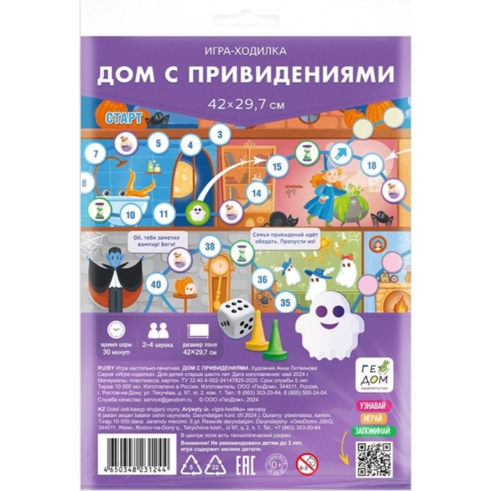 Новая игра-ходилка «Дом с привидениями» имеет удобный формат и подойдёт для всей семьи! Разложите поле, выберите фишки и отправляйтесь в весёлое путешествие по симпатичному дому, где бродят забавные призраки! Компактное поле легко разложить и удобно брать с собой: игра складывается до формата А5. Игра тренирует счёт, развивает мелкую моторику и внимание. В комплекте: игровое поле 42?29,7 см, кубик и 4 фишки. Рекомендованный возраст: 6+.