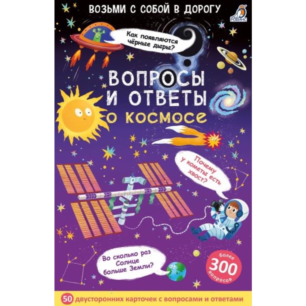 Как рождается звезда? Как часто на Землю падают метеориты? Почему Марс красный? Почему у кометы есть хвост? Всегда ли Полярная звезда из созвездия Малая Медведица указывает на север? Почему на МКС невозможно воспользоваться шариковой ручкой для письма? Почему в 2006 году Плутон исключили из списка планет Солнечной системы? В набор входят 50 двусторонних карточек с вопросами и ответами на самые часто задаваемые и необычные вопросы о космосе. Играя с карточками, ребёнок узнает интересные факты о планетах, звёздах, метеоритах, кометах, а также будет развивать память, внимание, логику, мышление и другие важные навыки. Что найдем внутри: 50 двусторонних карточек с вопросами и ответами на самые часто задаваемые и необычные вопросы о космосе. Важно знать родителям: - Набор предназначен для детей от 3 лет и старше. - Рекомендован для игр в компании и всей семьёй дома и в поездках.
