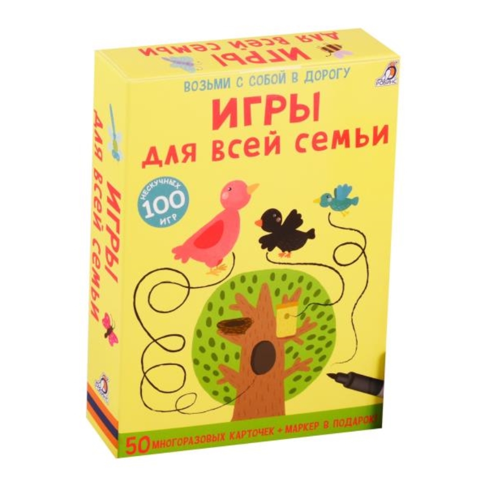 В набор входит 50 двусторонних многоразовых карточек с заданиями для разных возрастов: в нем есть игры и задания для дошкольников от трех лет, а также головоломки, которые будут интересны школьникам и даже взрослым. В чём особенность набора: - Каждая карточка – это интересная задачка и яркая картинка. - Благодаря удобному формату карточки можно брать с собой в дорогу. - Карточки сделаны из картона и покрыты защитной плёнкой. - Занятия с набором способствуют развитию логического мышления, внимания, речи, памяти, воображения и мелкой моторики. Что найдем внутри: 50 двусторонних многоразовых карточек, карточки с ответами и маркер на водной основе для работы с набором. 100 увлекательных игр-заданий разных уровней сложности и видов: лабиринты, головоломки, "дорисуйки", хитрые задачки и задания типа "найди лишнее", "найди отличия", "найди спрятанные картинки" и много-много других. Важно знать родителям: -Набор карточек предназначен для детей от 3 лет, а также для детей школьного возраста и родителей. - Для работы с карточками можно использовать любой фломастер на водной основе, который легко стирается, что позволяет выполнять задания много раз. - Рекомендовано как для индивидуальных, так и для групповых занятий, а также для игр в семье, в компании и в поездках.