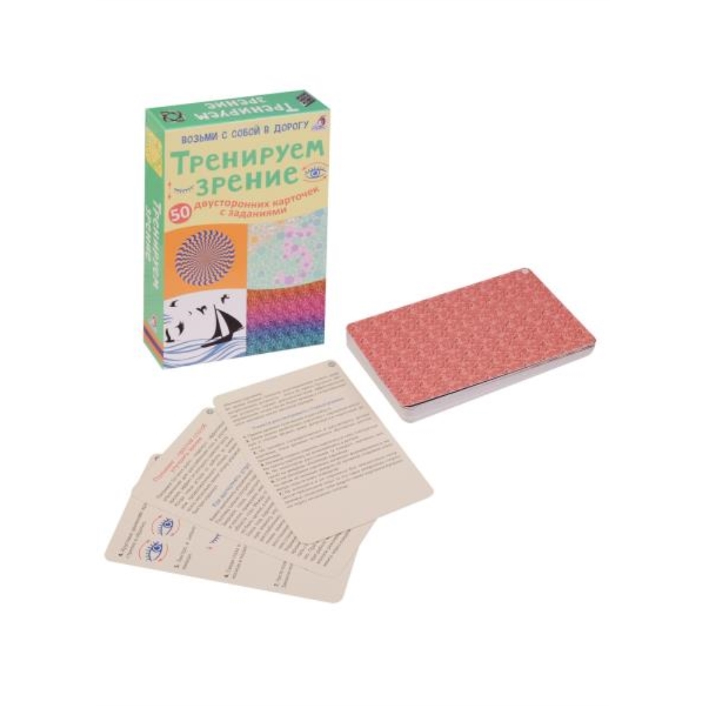 Набор карточек «Тренируем зрение» создан при поддержке ведущих офтальмологов специально для профилактики утомляемости глаз, улучшения, коррекции, восстановления и разгрузки зрения. В составе набора карточки со зрительной гимнастикой, стереограммами, полихроматическими картинками, оптическими иллюзиями, а также популярные игры для профилактики "ленивого" глаза: "лабиринты", "путаница", "кто здесь лишний", "соедини по точкам", "найди отличия" и другие интересные и полезные задания. В чем особенность набора: - Каждая карточка – это интересные вопросы и яркая картинка. - Карточки можно брать с собой в дорогу. - Карточки сделаны из картона и покрыты защитной плёнкой. - Занятия с набором способствуют улучшению зрения, развитию воображения, логического мышления, внимания, памяти и мелкой моторики. Что найдем внутри: 50 двусторонних карточек, карточки с упражнениями для тренировки зрения. Важно знать родителям: - Набор карточек предназначен для детей от 4 лет, но будет интересен и детям более старшего возраста, и даже взрослым. - Регулярные занятия по карточкам помогут разгрузить и улучшить зрение, избавить глаза от усталости как детям в возрасте от 5 лет, так и взрослым. - Рекомендуется использовать карточки после длительной однообразной работы, требующей напряжения глаз: чтение, работа за компьютером и гаджетами, просмотр телевизора и пр.. - Карточки отлично подходят для индивидуальных и групповых занятий, а также для игр в компании, семейного досуга дома и в поездках.