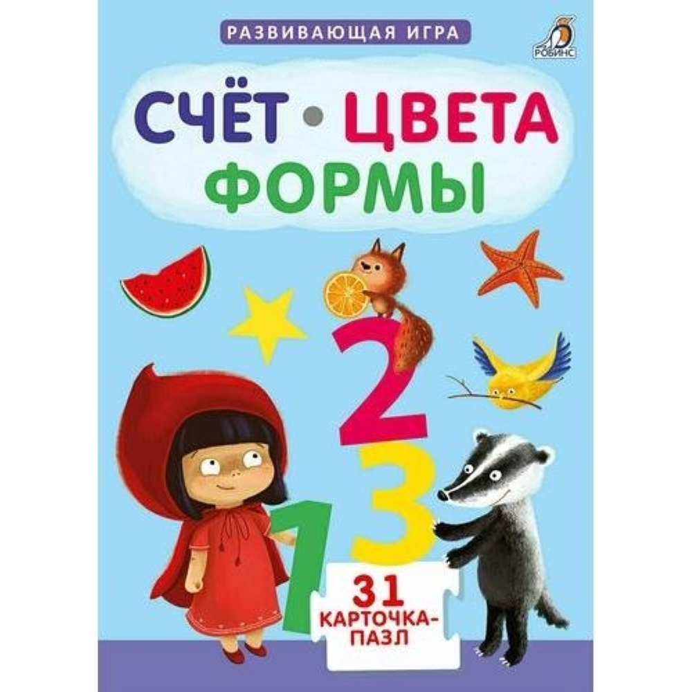 "Счет. Цвета. Формы" - это обучающая и развивающая игра из 31 двусторонней карточки-пазла и 2 карточек с инструкцией. С ее помощью ваш ребёнок легко и быстро выучит цифры, цвета и формы, а также научится сравнивать, считать и придумывать загадки. В чем особенность набора: - Карточки-пазлы выполнены из плотного ламинированного картона со скругленными уголками. – Все карточки-пазлы идеально стыкуются друг с другом. – Примеры можно решать прямо на карточках с помощью маркера на водной основе (в состав набора маркер не входит) – Благодаря удобному формату карточки можно брать с собой в дорогу. – Занятия с карточками способствуют развитию мышления, памяти, внимания и мелкой моторики. Что найдем внутри: 31 двустороннюю карточку-пазл из плотного картона и 2 карточки с инструкцией. В состав набора входят: - двойной комплект цифр от 0 до 9 - карточки с математическими знаками (больше, меньше, плюс, минус и равно) - примеры для первого счета - карточки с цветами и формами. Важно знать родителям: - Пособие предназначено как для индивидуальных занятий с детьми дома, так и для использования в детских дошкольных учреждениях. - Составляйте упражнения самостоятельно или пользуйтесь карточками с инструкцией. - Набор предназначен для детей от 3х лет.
