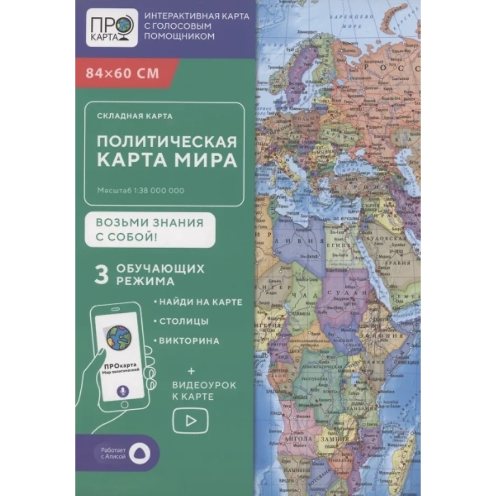 «ПРОкарта» – новая линейка интерактивных карт с голосовым помощником и отличный тренажер для изучения географии. Найди на карте QR-код и смотри видео "Простой способ понять карту". Запусти навык "ПРОкарта. Мир политический" и используй один из 3 режимов или сразу все! Голосовой помощник поможет узнать новое, будет задавать вопросы, давать подсказки и попросит найти объекты на карте. Данная политическая карта благодаря большому размеру 84х60 см самая подробная, по ней удобно изучать современное политическое устройство мира, границы государств и владений, демаркационные линии. Территории государств выделены цветом и подписью названия государства. Населённые пункты отображены по числу жителей и политическому значению, показаны основные пути сообщения и международные судоходные каналы, аэропорты и морские порты. От повреждений и выцветания карта защищена ламинацией.