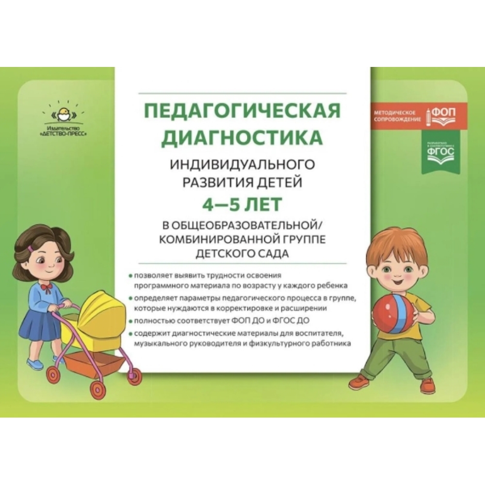 Предлагаемое практическое пособие разработано с целью оптимизации образовательного процесса в дошкольной образовательной организации с общеразвивающими или комбинированными группами, которые посещают дети 4—5 лет, и содержит параметры для оценки развития ребенка по пяти образовательным областям согласно ФГОС ДО. Предлагаемые критерии оценки развития ребенка соответствуют Федеральной образовательной программе дошкольного образования (приказ Министерства просвещения России от 25 ноября 2022 г. № 1028, зарегистрирована 29 декабря 2023 г.) (ФОП ДО) в разделах, посвященных работе с дошкольниками 4—5 лет. Уровневая оценка позволяет не только оценить индивидуальные особенности развития ребенка, но и определить успешность реализации педагогического процесса в группах для детей 4—5 лет. Командный подход не требует разработки отдельных диагностических подходов от педагогов группы (воспитателя, музыкального руководителя, инструктора по физкультуре), т. к. данное пособие обеспечивает их диагностическими таблицами в комплексном варианте по всем пяти образовательным областям. В конце пособия приведен примерный образец отчета по итогам педагогической диагностики за учебный год для старшего воспитателя, удобный для хранения (всего 1 лист), с фиксацией работы с родителями , воспитывающими детей с трудностями усвоения программного материала, что актуально в современных образовательных условиях. Издание адресовано педагогам дошкольных образовательных учреждений (воспитателям, музыкальным руководителям и физкультурным работникам), заведующим и заместителям заведующих по ОВР, старшим воспитателям. Пособие может быть интересно родителям для оценки развития своего 4—5-летнего ребенка, а также студентам, обучающимся по направлению «Педагогические науки», профиль «Дошкольное образование».