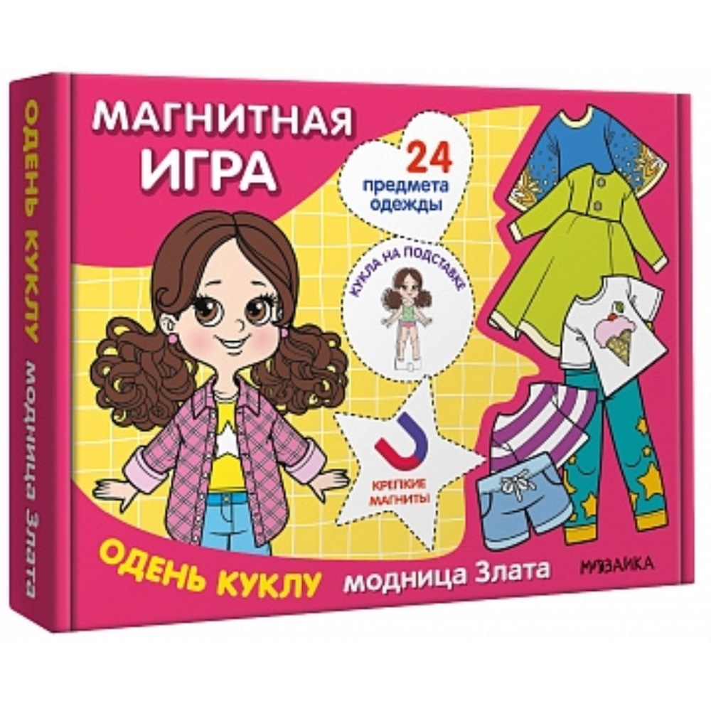 Одень куклу. Модница Злата (серия Магнитная игра) «Одень куклу. Модница Злата» — это игра, которая надолго займет ребенка и разовьет его фантазию. В коробке находится фигурка куколки и 24 магнитных предмета одежды. Кукла устанавливается на подставку, после чего можно подобрать ей подходящий наряд для любого случая. Одежда на крепких магнитах хорошо держится на кукле, поэтому с ней можно полноценно играть. А если собрать всю коллекцию, то вариаций для игр станет ещё больше — одежда из разных наборов подходит всем куклам в серии.