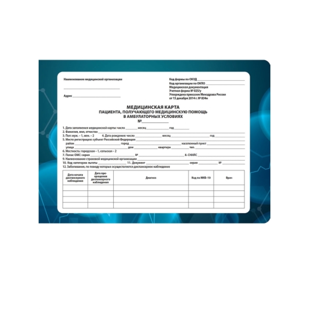Медицинская карта пациента, получающего медицинскую помощь в амбулаторных условиях, необходима каждому человеку и используется в поликлиниках в обязательном порядке. Наша карта составлена по форме № 025/у, утверждённой Минздравом России и содержит разделы для сведений о диагнозах, назначениях и многом другом, а также большое количество дополнительных страниц для записи всех данных о вашем здоровье. Благодаря твёрдой обложке карта прослужит долгие годы.