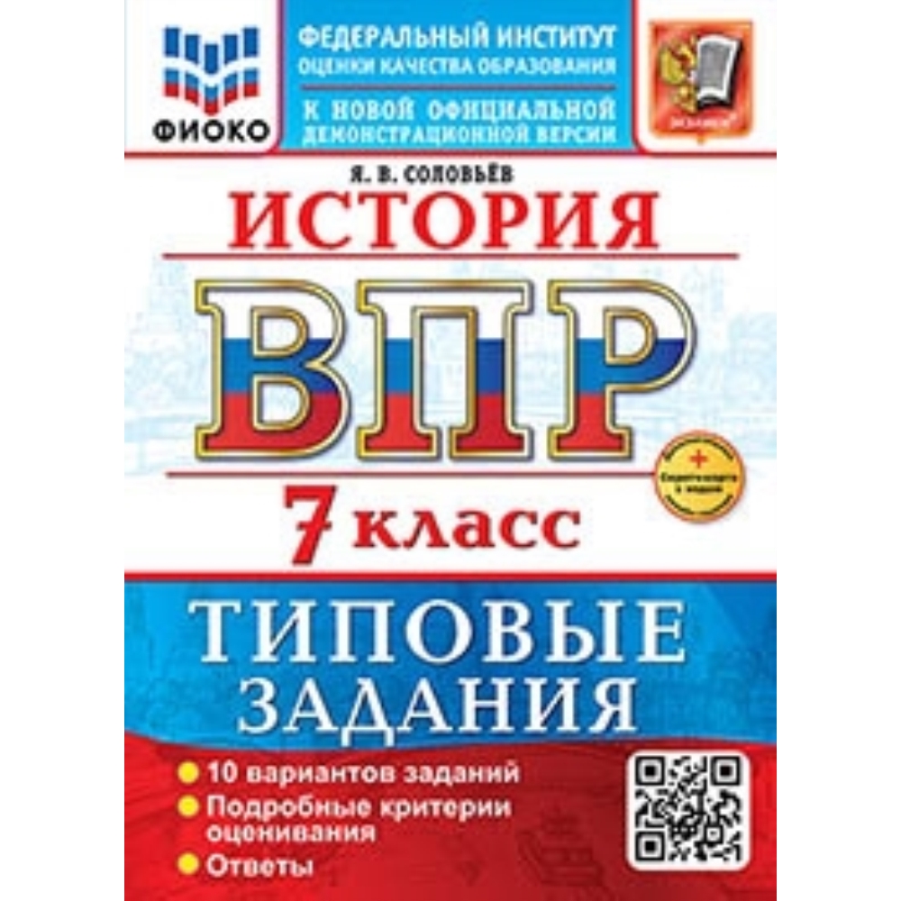 Данное пособие полностью соответствует федеральному государственному образовательному стандарту. Книга содержит 10 вариантов типовых заданий Всероссийской проверочной работы (ВПР) по истории для учащихся 7-х классов. Сборник предназначен учащимся 7-х классов, учителям и методистам, использующим типовые задания для подготовки к Всероссийской проверочной работе по истории. Я. В. Соловьёв - кандидат исторических наук, доцент кафедры истории России Государственного университета просвещения, старший научный сотрудник Научно-просветительского отдела Государственной публичной исторической библиотеки России, автор пособий по истории России, ЕГЭ, ОГЭ и ВПР.