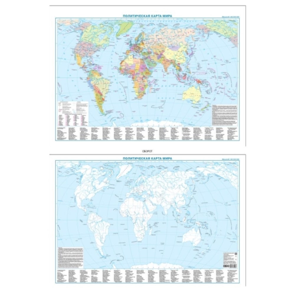 Политическая карта мира и Контурная карта мира На одной стороне листа – «Политическая карта мира» масштаба 1:40 000 000 (в 1 см 400 км). На карте мира выделены разными цветами государства, владения и территории с особым статусом, даны их государственные границы. Населённые пункты на карте даны в двух градациях столицы государств и прочие населенные пункты. Карта дополнена списком государств и их столиц по континентам. На другой стороне листа ламинированная контурная карта – «Политическая карта мира» масштаба 1:40 000 000 (в 1 см 400 км), на которой возможно подписывать и раскрашивать объекты стирающимися маркерами. Рекомендовано для широкого круга пользователей.
