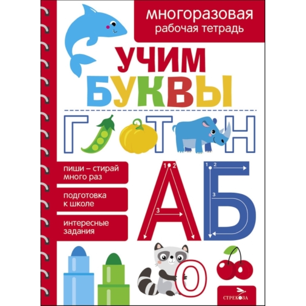 Эта многоразовая тетрадь поможет вам познакомить ребёнка с буквами. В ней много заданий, направленных на запоминание образов букв: найти заданную букву на картинке, вписать буквы в слова, обвести предметы, названия которых начинаются с изучаемой буквы, и