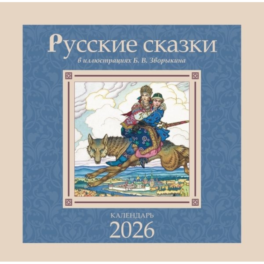 Настенный календарь на 2026 год с уникальными иллюстрациями 1930-х годов известного художника-графика Бориса Васильевича Зворыкина к четырем русским сказкам: "Сказка об Иване-царевиче, жар-птице и о сером волке", "Марья Моревна", "Василиса Прекрасная" и "Снегурочка".