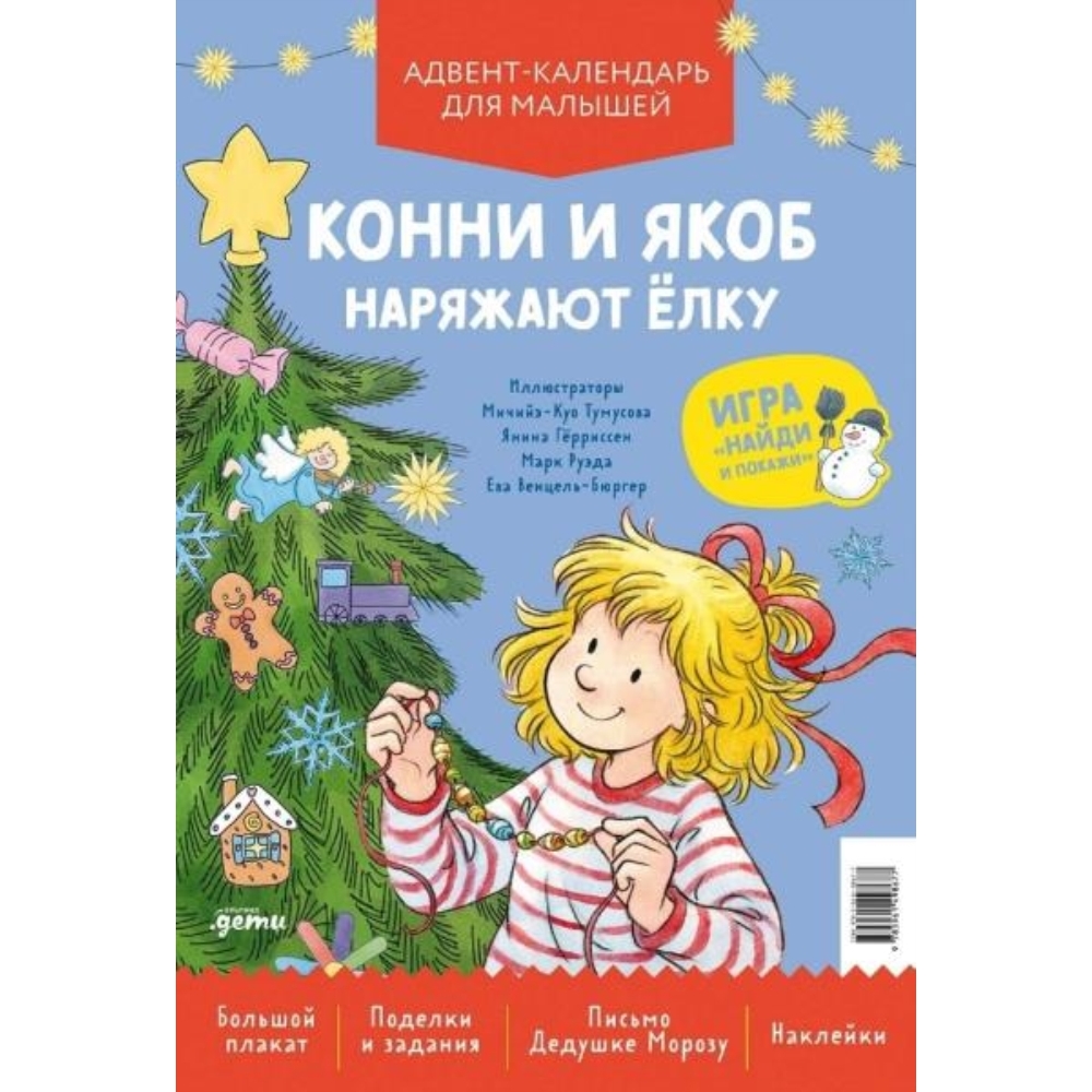Готовимся к Новому году вместе с любимыми героями Играем и наряжаем елку вместе с Конни и Якобом Эта новогодняя игра для детей от года сделает досуг с ребенком необычным и увлекательным. За несколько дней до Нового года повесьте плакат на стену и каждый день добавляйте вместе с малышом наклейки-игрушки на елку так, чтобы к празднику она была украшена вся. Плакат станет не только ярким украшением комнаты, но и развивающим пособием: играйте в "Найди и покажи" вместе с ребенком, обсуждайте героев серии, собирайте поделку - развивайте внимание, концентрацию и словарный запас малыша играя. В наборе: Большой плакат (А1) Наклейки Поделка в комплекте
