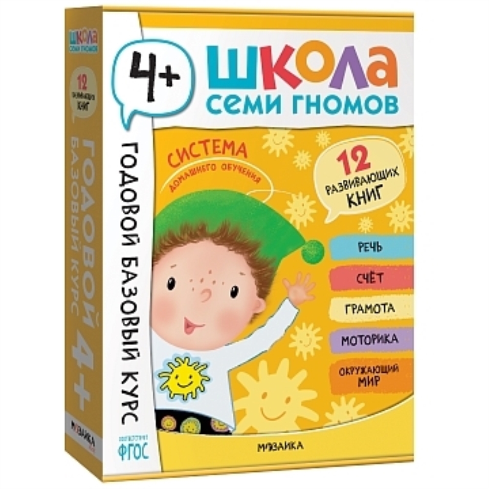 Годовой базовый курс. Комплект 4+ (Школа Семи Гномов. Базовый курс), 12 книг + развивающие материалы Школа Семи Гномов – это система, а не набор книг. Комплекс из 12 книг направлен на всестороннее развитие ребенка. 6 книг для развития когнитивных способностей: познавательный интерес, умение думать, анализировать, делать выводы. И еще 6 книг для на знакомства с окружающим миром, его закономерностями и взаимосвязями. Система выстроена таким образом, чтобы ребенок получил необходимые знания в правильный момент. Поэтому все книги в Школе Семи Гномов имеют четкую возрастную адресацию и разработаны строго с учетом возрастных возможностей ребенка. Но самое важное, чтобы занятия с ребенком давали результат и приносили радость. Поэтому все задания выстроены от простого к сложному и следуют принципу «развитие через игру». Заниматься с ребенком может любой взрослый, специальных знаний и опыта не требуется. Родительская страничка в каждой книге подскажет, что, как и почему нужно развивать в данном возрасте. А еще в Школе Семи Гномов очень сложно заблудиться, ведь каждому возрасту соответствует свой цвет и свой герой. В течение всего обучения ребенка сопровождают семь Гномов – персонажи, списанные с детей соответствующего возраста. Четырехлетнего ребенка сопровождает желтый цвет и гномик Лучик. Обучение — это приключение. Пристегните ранцы!