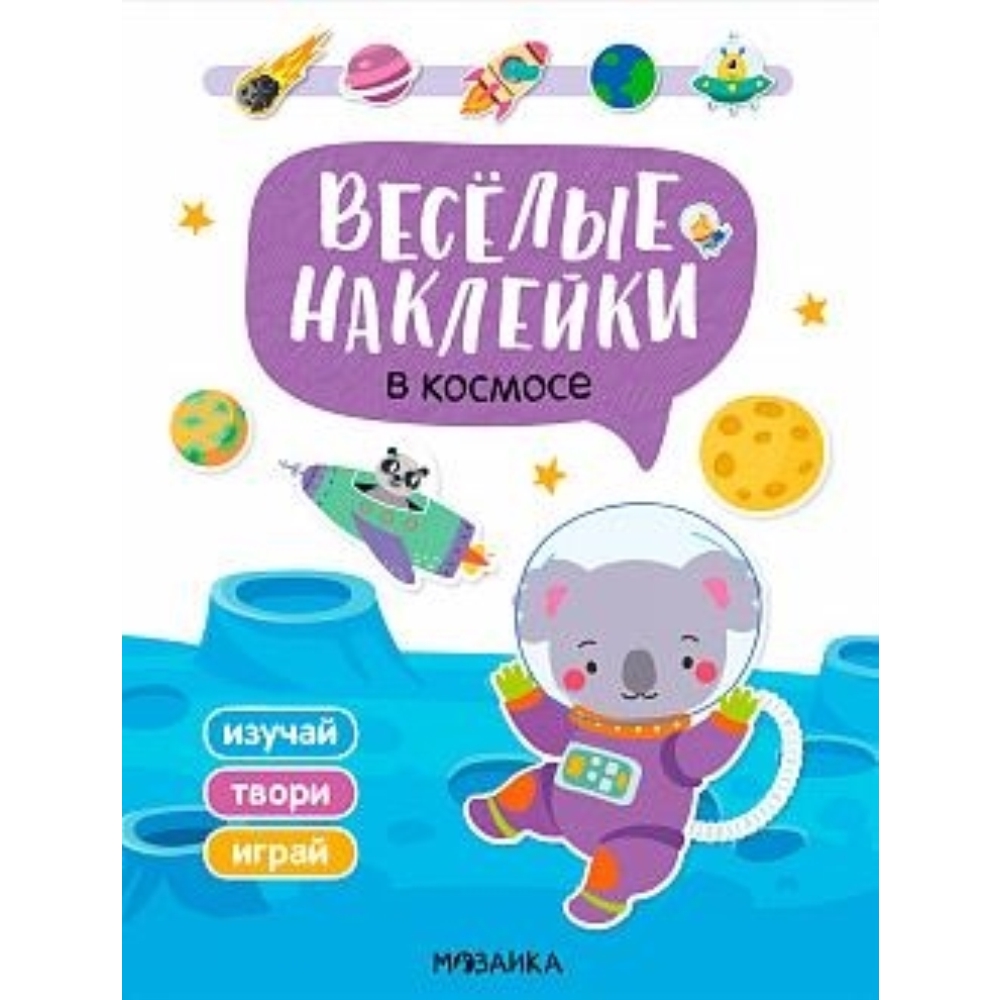 В космосе (Веселые наклейки), книга с наклейками Книга «В космосе» серии «Веселые наклейки» позволит ребенку самостоятельно, без помощи родителей, весело провести время и одновременно позаниматься. Играя с наклейками, ребенок пополнит словарный запас, разовьет фантазию и память, счет и творческое мышление. Наклейки космонавтов, планет, космических кораблей можно приклеивать, где угодно. Они подойдут и для первого знакомства с наклейками, и для малышей постарше.