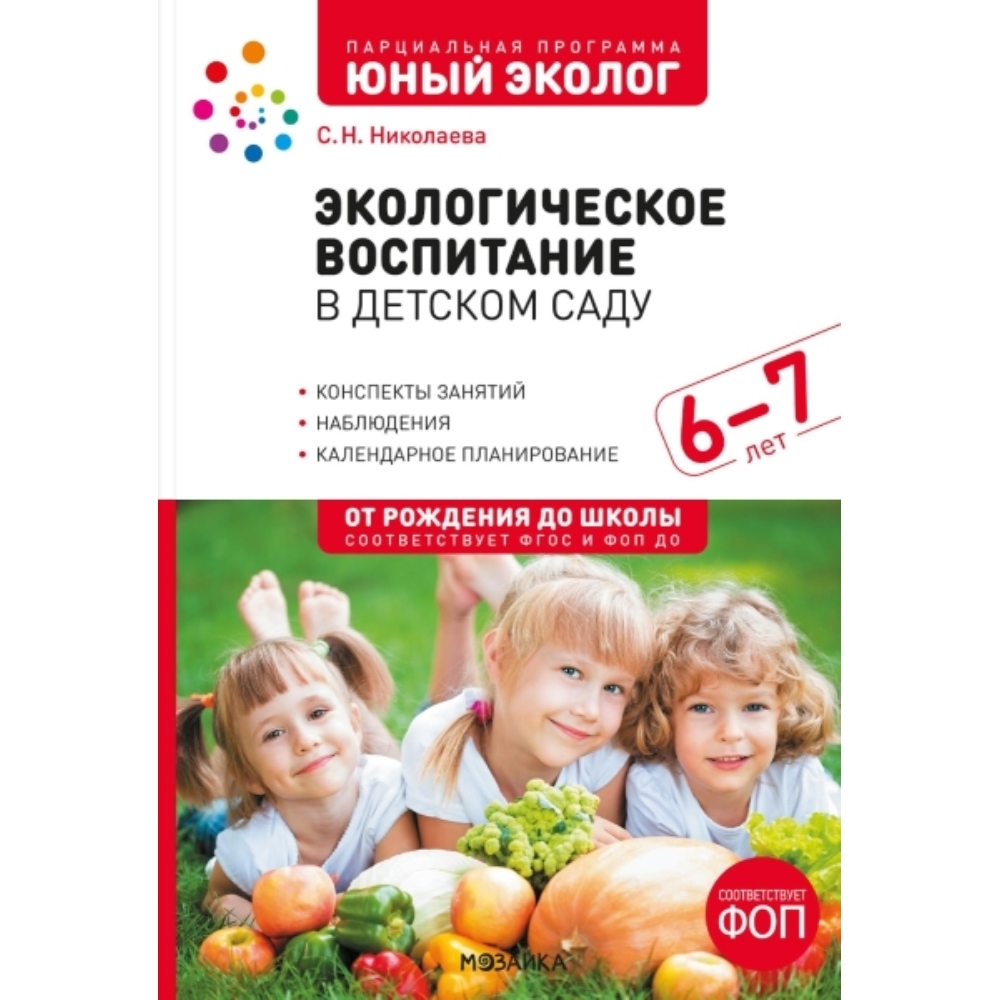 Экологическое воспитание в подготовительной группе детского сада. 6-7 лет. ФГОС. ФОП Парциальная программа С.Н. Николаевой «Юный эколог» рекомендуется в рамках реализации принципа вариативности содержания программы «ОТ РОЖДЕНИЯ ДО ШКОЛЫ». В данном пособии представлена система работы по экологическому воспитанию детей старшей группы детского сада 6–7 лет. Предлагаемая система работы с детьми включает в себя разные формы и методы: это циклы наблюдений за растениями и животными, ведение различных календарей, непосредственная образовательная деятельность, целевые прогулки, экскурсии, развлечения и игры. Значительное место в методике работы с дошкольниками отведено творческой деятельности: рисованию иллюстраций после прочтения каждого рассказа книги В. Танасийчука «Экология в картинках». Самодельно изготовленные книги являются результатом совместных усилий и демонстрируются на праздниках, посвященных экологии и выставках. Книга содержит: • календарное планирование; • конспекты занятий; • наблюдения; • рекомендации для воспитателя по проведению занятий. Пособие адресовано педагогам дошкольных образовательных организаций,студентам и преподавателям педагогических колледжей и вузов.