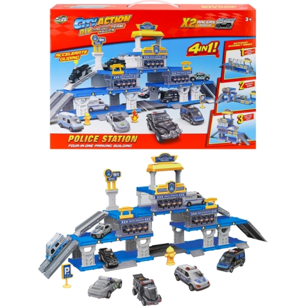 Игровой набор Парковка. В разобранном виде размер: 71.5х15х28 см. Варианты сборки 4 в 1. В наборе: 2 металлических машинки. Размер коробки 42х30х7 см.