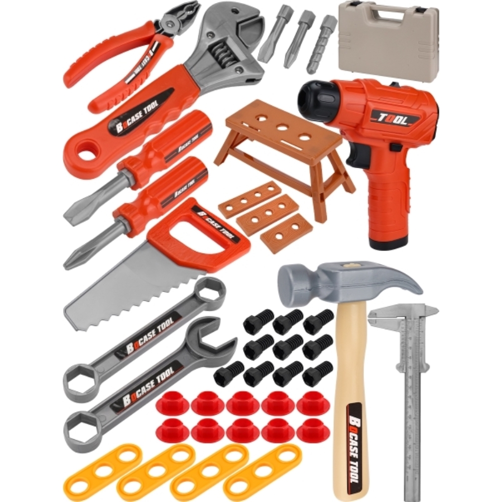 Набор инструментов "Юный мастер" понравится любому ребенку! Развивает мышление и мелкую моторику. В комплекте 45 предметов. Дрель работает от батареек (не в комплекте). В кейсе.