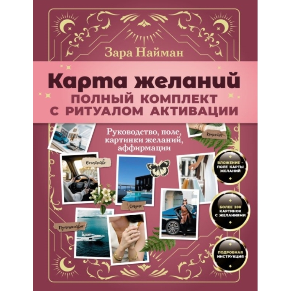 Готовый набор карты желаний: книга-гайд по составлению, поле, картинки для вырезания и аффирмации. Издание станет прекрасным подарком самой себе, а также близким девушкам и женщинам вашей жизни! Карта желаний - это коллаж из фото и журнальных вырезок, символизирующих ваши мечты. Она позволяет более точно сфокусироваться на желаемом и сформулировать четкие цели, благодаря чему вы начинаете видеть пути их реализации. Вдохновляясь образами вашей идеальной жизни на карте, подсознание начинает стремится к ней и делать все для ее достижения. Читайте инструкцию, подбирайте и вырезайте из специального блока нужные картинки, наклеивайте их на поле-карту, которая также входит в набор, дополняйте мощными аффирмациями. В книге вы найдете также специальный ритуал, который поможет активировать карту так, чтобы ваши желания начали осуществляться как можно быстрее. В книге вы найдете ответы на вопросы: как работает карта желаний? как правильно ее активировать? как не просто насладиться процессом создания коллажа, а получить практический результат? В комплекте более 200 картинок с изображениями возможных желаний из разных сфер жизни. Вы можете использовать их или найти свои собственные образы. Карта желаний - не только способ понять себя и настроить свое мышление на реализацию задуманных планов, но и прекрасная арт-терапия, возможность хорошо и с интересом провести время. Когда вы методично вырезаете, а после клеите картинки желаний на ватман, вы находитесь в двух состояниях сразу. С одной стороны, вы сфокусированы на том, что перед вами, - на образах того, к чему стремитесь, а с другой - вы расслаблены, открыты. Погружаясь в творческий процесс работы с картой, вы перестаете слишком много думать о негативном, критиковать себя за желания, переживать, что получится реализовать, а что нет. И это поддерживает позитивные изменения, направляя вас к осуществлению истинных желаний.