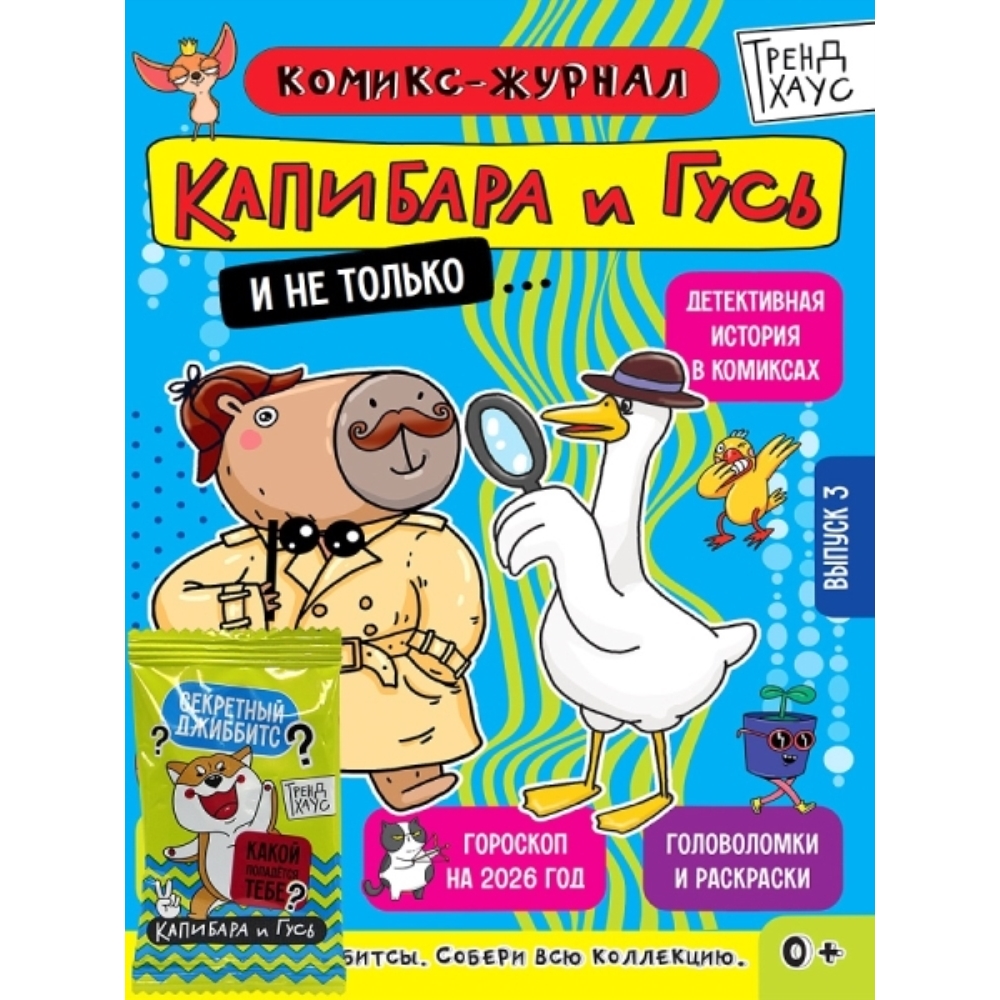 «Трендхаус» представляет! Крутые журналы «Капибара и Гусь»! Сразу три! Комиксы, рецепты, нескучные задания, гороскоп и ещё много-много всего интересного. И-и-и... па-бам! С каждым журналом - джиббитс! Собери все, найди самый редкий!