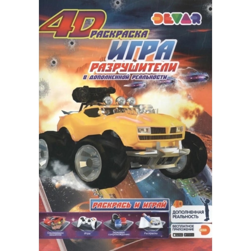 Приготовьтесь к соревнованиям монстр-траков в обновленной раскраске серии «Драйв» от DEVAR. У вас появится собственная машина-бигфут. Раскрасьте её в дикие цвета и проведите по бездорожью! Круто? Супер-круто! Всё это становится возможным, если использовать раскраску «Разрушители» вместе с бесплатным приложением DEVAR на планшете или смартфоне.На каждом развороте в раскраске представлены цветная модель монстр-трака и проекционные виды, которые можно раскрасить и воспроизвести с них движущуюся 3D-модель прямо на столе или у себя на ладони. Нажмите иконку с автомобилем в приложении DEVAR, и Ваша модель перенесется на трассу. Почувствуйте себя участником гонок монстр-траков. Соревнуйтесь с другими авто в скорости и ловкости!