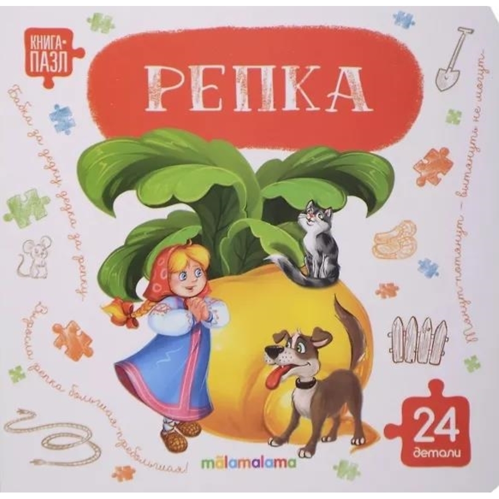Книга-пазл "Репка" — это первое знакомство с традиционной сказкой в игровой форме! В книге — 4 пазла, в каждом из которых 6 крупных деталей. Под пазлами — яркие картинки с подсказками. Удобная для детских пальчиков выемка поможет малышу легко научиться самостоятельно вынимать и складывать детали. Поэтому книги-пазлы — это ещё и развитие мелкой моторики, логики, воображения, пополнение словарного запаса. А ещё книга небольшого формата — её удобно взять с собой в дорогу или на прогулку. Узнавать новое интереснее вместе с Malamalama!