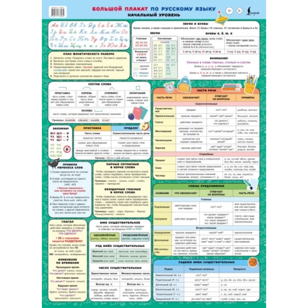 Ребёнок постоянно забывает правила русского языка? Хотите привить ребёнку интерес к изучению русского? Большой красочный плакат (формат 43,5?60 см) по русскому языку - это компактная и визуально понятная шпаргалка для начального уровня. Здесь собрано всё, что действительно нужно в первые годы обучения: алфавит, звуки, буквы, части слова, правила переноса слов, части речи, члены предложения и многое другое. Вся информация структурирована в наглядные таблицы и легко воспринимается. Плакат создан для младших школьников.